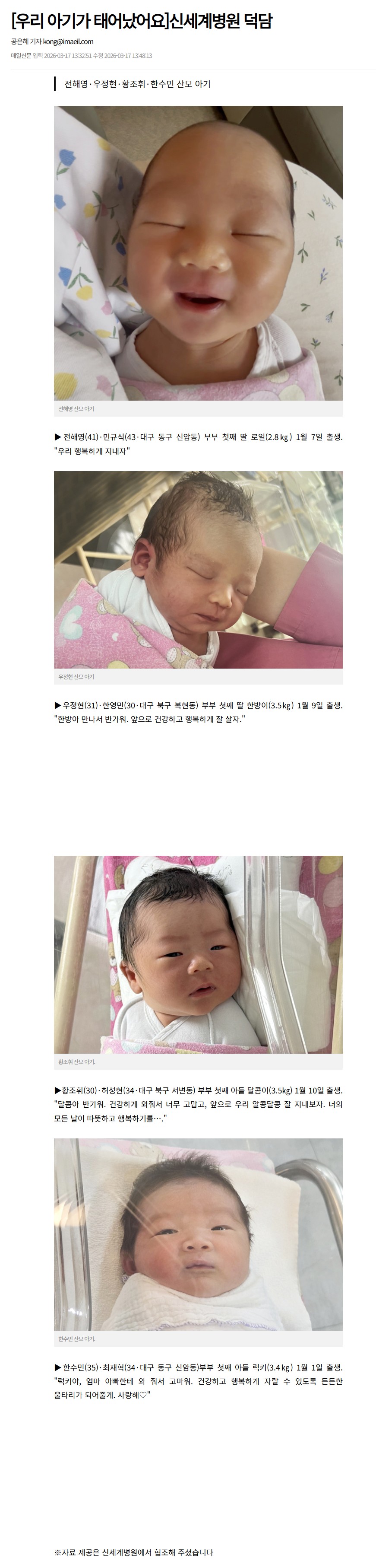 전해영·우정현·황조휘·한수민 산모 아기